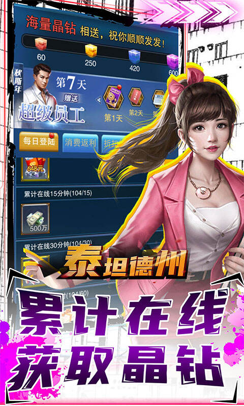 泰坦德州折扣充值让你游戏更加畅快!上线送钻石,元宝,金币、vip等级,在这里你可以体验到各种福利。