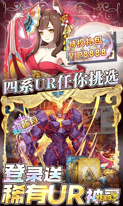 ★超级VIP、20w钻石、2888w金币、1000元充值卡 ★首日登录即送UR,轻松搭配合击阵容 ★送200抽活动,除送连抽之外,还送2个UR任选箱 ★任选UR、稀有UR活动让你获得海量养成材料,UR轻松满星不是梦 ★升级闯关免费送500W代币券 ★挂机也能得充值卡 ★每日活跃送330元充值 ★神灵馈赠活动每日免费任选豪华奖励 ★每日签到送盲盒,海量珍惜道具、充值等你拿 ★海量活动真充卡激活,0氪也能获得海量资源 ★充值比例1:3000