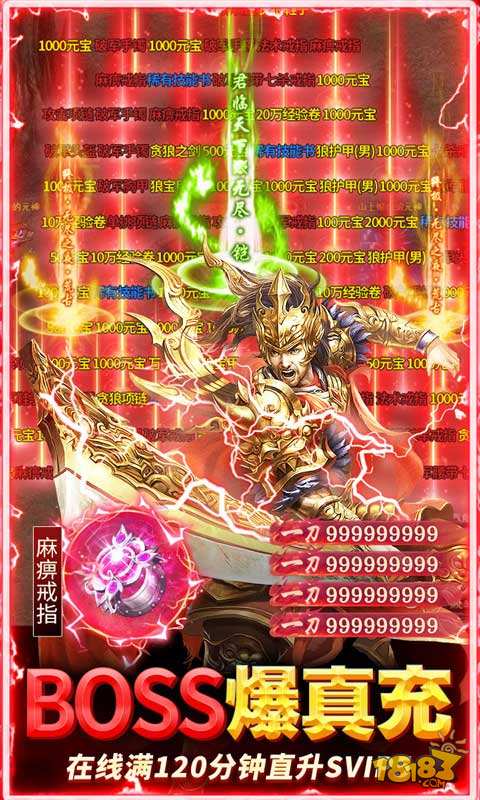 1、免费点充648、5秒真男人够猛你就来! 2、上线送满V、传世屠龙刀、绝版称号,创角大礼包! 3、开局领VIP10,1000万元宝、1亿金币! 4、登录奖励,登录七天送炫酷幻化和巨额充值卡! 5、打BOSS爆巨额充值卡,一刀暴富不是梦! 6、冲击榜单,最高可获得UR级幻化奖励