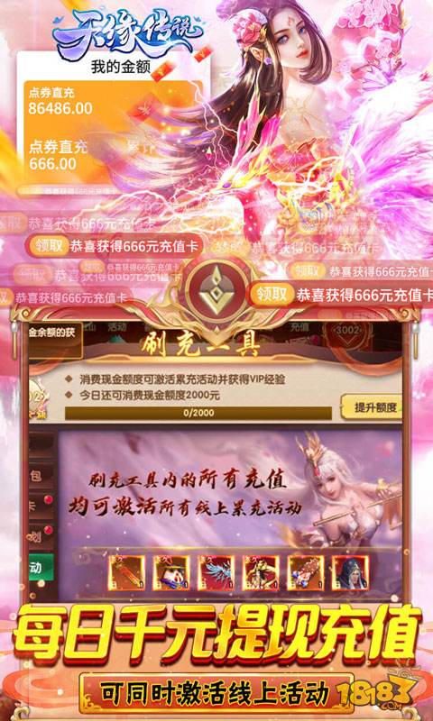 1.上线送vip6 送炫酷时装 仙玉*18888 灵玉*18888 现金充值卡1000元 2.刷充工具免费解锁首充 3.刷充工具免费解锁外挂特权卡、弑神特权卡 4.刷充工具免费解锁每日限购高价值珍惜礼包 5.刷充工具免费解锁10倍高价值投资 6.刷充工具每日千元提现充值,激活线上活动 7.月卡每日领取超大额翻倍现金充值、充值额度
