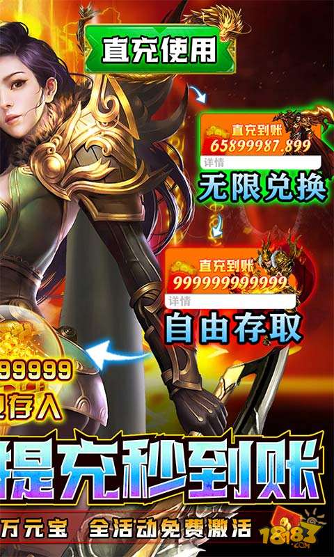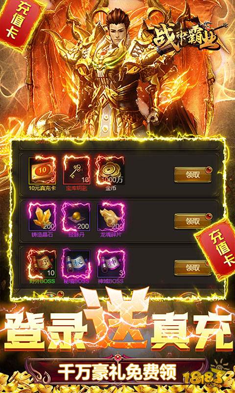 传奇动作手游《战神霸业》携全新内置余额宝玩法重磅回归!创角登录送百万元宝,免费激活青铜特权。开启余额宝功能,每日击杀boss可无限获得直充卷且激活所有累充活动!BOSS爆率全部上调1000%,无限爆真充,福利拉满在线打金!每日领取gm福利,无限领取金币元宝真充卡!快邀请兄弟齐聚沙城,称霸全服!