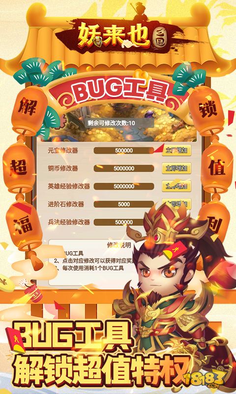 《妖来也(BUG修改器刷充)》是一款三国卡牌手游,经典6v6,体验各时代英雄集结的力量,统率三军征战四方,一统乱世!不必担心粮草,BUG修改器在手,天下我有,随时随地自由修改游戏数值,科技的力量已经无所不能啦!快来跟三国猛将一起体验吧!