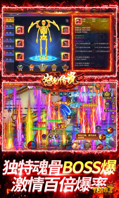 【怒剑传说】:上线送满级VIP、黄金贵族、28888福利金钻、100万钻石、限定称号、限时体验时装、实物盲盒。送十年魂环,属性提升爆率狂飙。上线极致攻速体验,最高可提升200%攻速。激情百倍爆率,全新魂环超变。独特魂骨BOSS爆,套装属性很诱人。