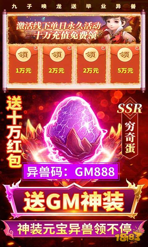 1、上线送VIP20、元宝*888888、超级礼包,绝版称号、上线就起飞! 2、立送高级百连抽,超强SSSR异兽拿到手软,七天更送一套无敌阵容! 3、无限资源免费送,毕业异兽免费领! 4、升级送十万红包、GM神装在线领! 5、月卡终身卡基金连登送,挂机无限刷真充!
