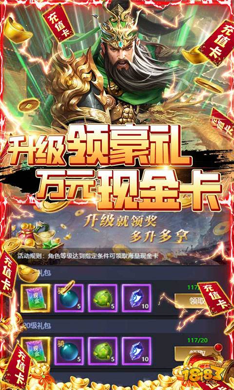登录直送GM1,SSR蔡文姬,50W绑元,1000W银两 GM钱包免费直充,激活大部分活动领海量福利 连续登录领SSSSR红将,助力主公,战力飙升 每日签到领充值卡,保底月入1万元以上充值卡 升级领万元现金卡,可激活大部分线上活动
