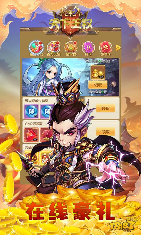 上线福利:vip20,66万元宝,648红包*1,168000金条,曹操*1,SSSSR武将礼包