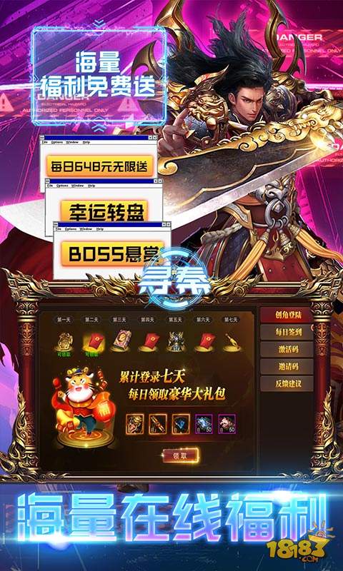 上线送满v,酷炫时装,绝版称号,还有海量材料!小怪无限掉红包,游戏内所有装备均可掉落,更有“破解工具”,额度激活直购礼包、投资和首充,奖励领到你手软。 每日签到送巨额直充卡、每日在线免费送648元礼包、七日狂欢送酷炫时装和绝版秘籍。 强烈推荐!!!