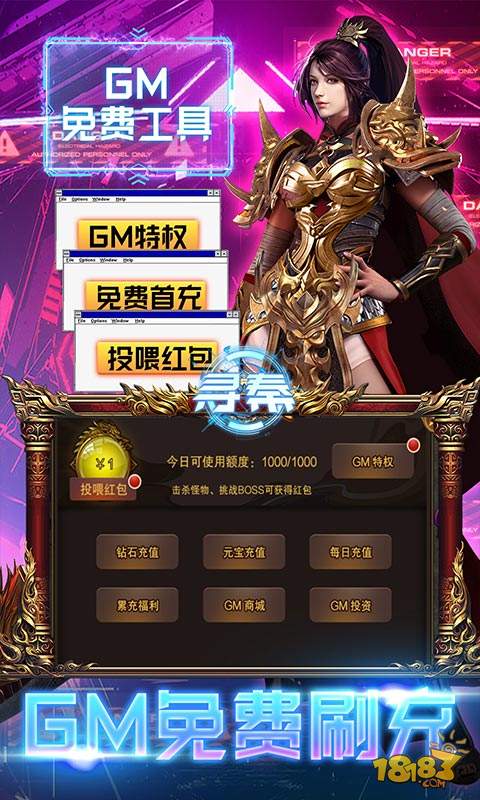 上线送满v,酷炫时装,绝版称号,还有海量材料!小怪无限掉红包,游戏内所有装备均可掉落,更有“破解工具”,额度激活直购礼包、投资和首充,奖励领到你手软。 每日签到送巨额直充卡、每日在线免费送648元礼包、七日狂欢送酷炫时装和绝版秘籍。 强烈推荐!!!