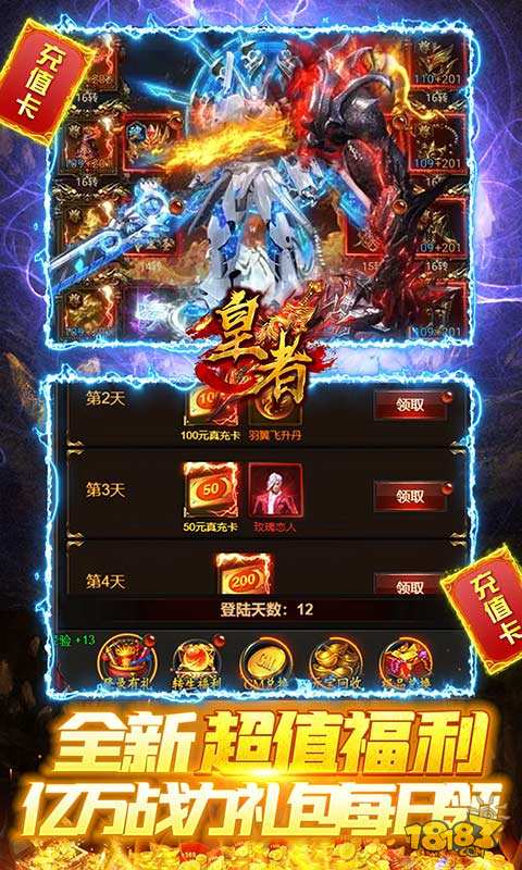 1、上线送vip15,100万元宝、豪华时装套,开局免费激活破解工具,打怪或者日常任务获得钱包余额,额度可直接免费激活超级礼包,战力百亿轻轻松松! 2、每日登录送巨额真充卡,海量豪华超值礼包,战力百亿轻轻松松! 3、充值比例1:10000,首充任意档位,最高可获得20倍返利,更有三大豪华投资礼包附送! 4、大幅修改游戏爆率,boss疯狂爆,保证跨服装备轻轻松松爆满地,不花钱也能当大佬,免费玩家首选! 5、内置战法道买断商城,激活可以将超级神装升至满阶,酷炫动态时装激活就送!