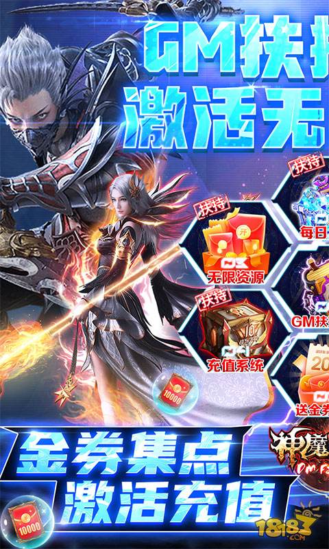 【神魔世界】:充值比例1:10000、登录直送GM2,500万钻石、500万紫钻、神钻卡包等 【GM工具】:全新GM扶持工具:每日礼包、时装外观、无限资源、钻石充值等统统可通过扶持工具免费获得 【金券集点】:全新金券集点玩法,完成简单任务即可获得海量金券。金券可激活游戏内大部分的充值活动,让你不肝不氪也可以变强! 【登陆集结】:在线即送万元充值卡,轻松获得1亿钻石。累计七天登录再送GM5、万元充值卡、海量资源材料、更有顶级幻化免费送 【特权集结】:激活特权卡,每日免费领取海量GM扶持点、金券和神钻,助力登战巅峰,驰聘神魔世界。