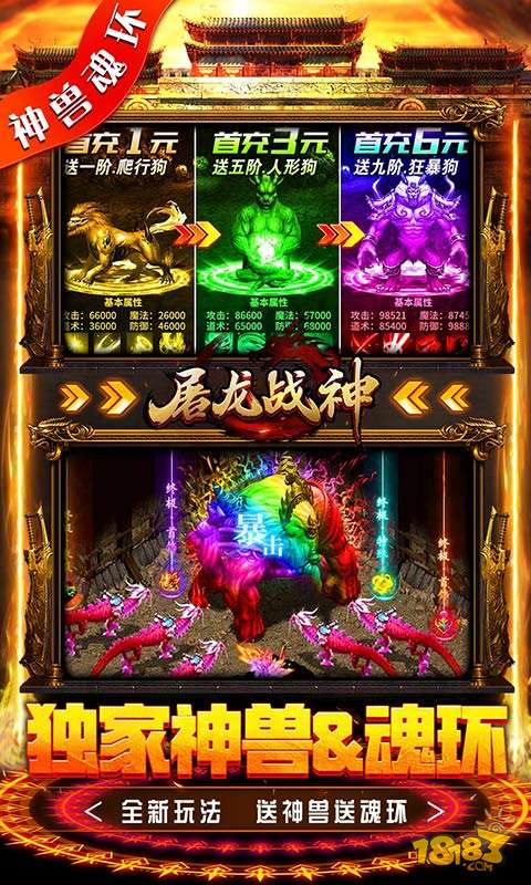 屠龙战神(首款神兽魂环)携神兽&魂环双系统,优质内挂系统革新上线! 创角即送终极技能、刀刀红绿毒、极品材料豪华大礼包,海量元宝,材料,实物盲盒每日登录送!独家神兽、魂环双系统均可免费获取,海量充值点限时首爆、个人首爆爆不停! 永久实物换真充,任意小怪均可掉落,玩传奇就是要爽!还有独创的优质内挂系统,特色夜间挂机机制,自动巡航,自动下图,挂机无忧!