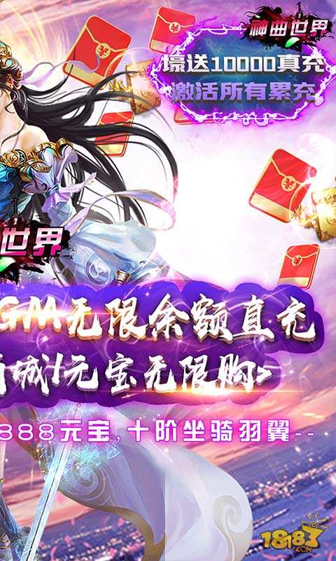 神曲世界(GM无限余额直充)无限余额免费直充全自动存入钱包,可直接在免费充值界面充值,充值激活所有累充,激活线下元宝返利!创角免费送GM,登陆送GM5,免费开启GM商城,全场道具1元宝无限购! 全地图自由飞行,跨越千山万水,千人同屏,暴燃仙界大战,华丽百变时装,伙伴灵宠等百变玩法,畅游最精彩的仙侠世界。