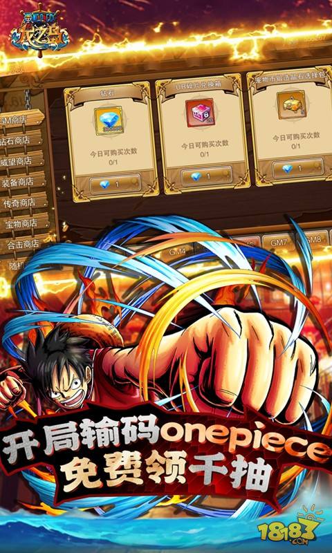 创角即送:永久真满V、钻石*128888,贝里*100w,1000连抽 1、开局输入礼包码“onepiece”即可领取1000连抽,强力伙伴任性抽! 2、上线就送永久真满V,所有vip礼包全部免费送! 3、每天登录并完成主线任务,送大量GM卡,GM商店特权都可以免费解锁! 4、每日活跃度达到100,就送真充卡加100抽,天天玩天天送! 5、连续登录30天游戏,就送最强四皇LR卡白胡子! 6、新增一钻商店,大量珍惜资源每日1钻购!
