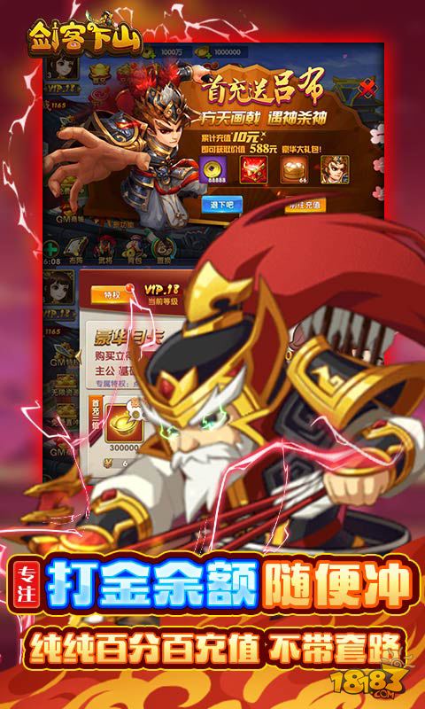 《剑客下山-GM无限打万金》是一款三国题材的策略卡牌游戏!!!精美的人物制作,超多有趣的游戏玩法,三国群英与神魔交汇,群魔乱舞;通关关卡刷装备,手指点点获得海量资源;这个版本氪金再也不是门槛,GM特权,直接刷新三观,拿不完的打金卡,天天满满当当的补贴福利;GM商城极品直接拉满不犹豫;无限资源,元宝在手,天下任我行!!!