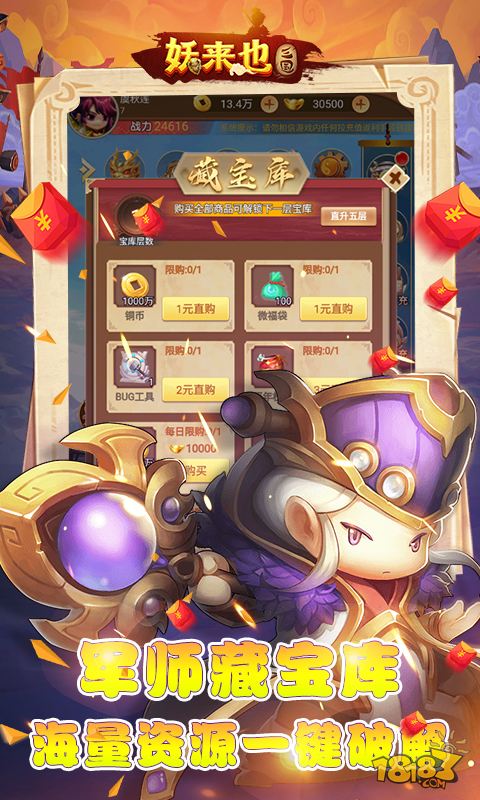《妖来也(BUG三国黑科技)》是一款三国卡牌手游,经典6v6,体验各时代英雄集结的力量,统率三军征战四方,一统乱世!通过对自身武将的培养,装备,升级等一系列增加战斗力物品的收集,在不同的对局中,派出不同的阵容进行对战,充分发挥玩家的谋略,拥有不一样的游戏体验!还能利用黑科技进行刷充,还在等什么?快和三国猛将一起闯天下吧!