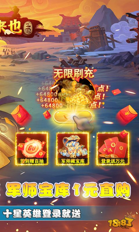 1、上线即GM3,元宝*1000万,红色套装宝箱*1,更有千元现金券赠送,打开你的邮箱惊喜连连!由你引领黑科技三国! 2、新人福利,登陆送万元现金券,还有十星英雄免费领!称霸三国天下指日可待! 3、战力豪华礼包,活动期间达到对应战力值即可领取高额奖励!不仅如此,累计消耗元宝达到指定数额,我们继续送!万能神兵,进阶石通通收入囊中! 4、充值比例1:10000,首充可得3倍元宝,充值指定金额还可领取超值奖励!缺什么买什么!再也不用费力升级了!限定十星自选箱你值得拥有! 5、七日登录,免费领豪礼!进阶石、封侯令通通带回家,只要你登录,每天送不停!科技三国等你引领!横刀立马 争霸天下!