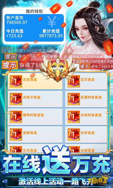 1、上线赠送游戏管理员、送满V、元宝*100W、绑定元宝*500W、银两5000W、以及海量材料; 2、充值比例1:2000,首充直接赠送50倍元宝、焱火麒麟,以及顶级称号; 3、登陆直接送游戏管理员后台,免费破解充值、免费累充、免费特权卡; 4、登陆在线送首充,顶级至尊武器、神兽·南小企免费领取; 5、一元盲盒任意购,体验一发入魂的快乐; 6、神权GM永久打BOSS掉落充值卡,元宝充值不用愁; 7、在线领取活跃欧皇大礼包(68级开启),千元充值随机抽取 8、无限资源阁开启永久无限领取各类资源,升级毫不费劲;