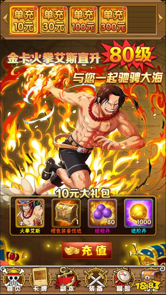 充值比例1:2000★上线即送2000元充值卡(领奖中领取),送超V、88888钻石、一千万贝里。豪华特权、超多资源享不停!★特权商城无限换材料和核心道具,海量道具随心换!★每日签到送金卡,豪华阵容免费享,推图无压力!★扫荡副本爆充值,海量充值无限享!★首充10元即可获得金色卡牌和橙色装备。充值小额档位,还能获得高额真充卡(可激活线上活动和特权商城)!★后缀说明:扫荡副本爆充值卡碎片,返回主界面进入无限商城兑换充值卡;特权商城每日可用钻石兑换大量材料和核心道具。
