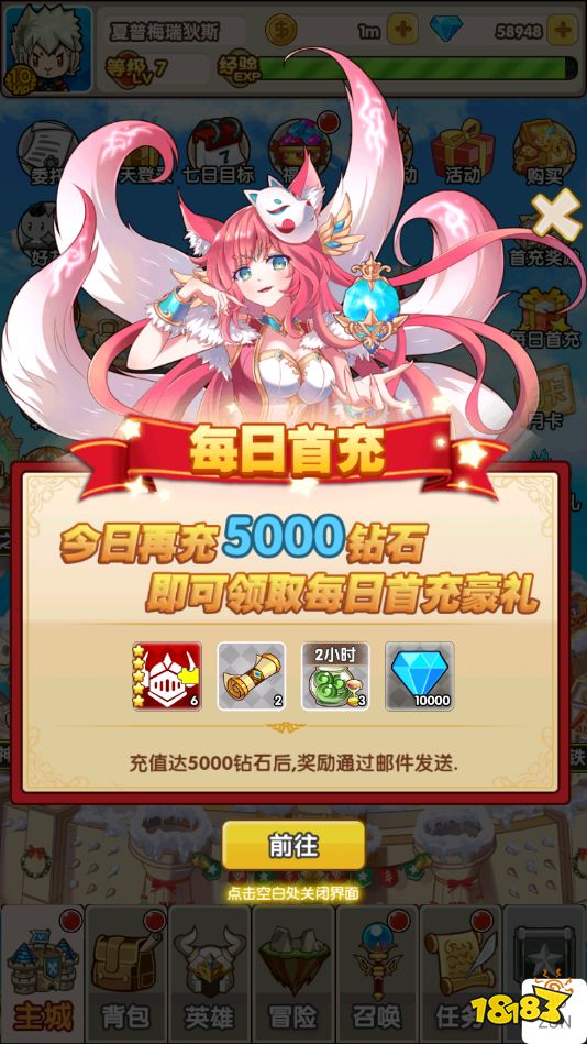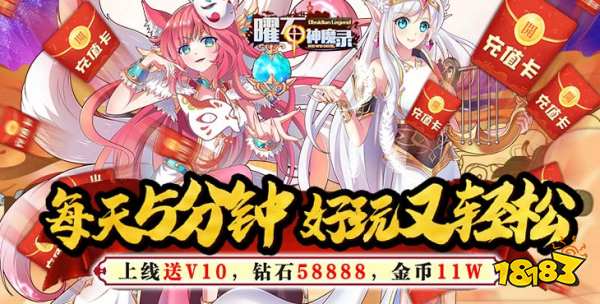 充值比例1:1000★登录送千元充值,七日登录活动领取海量抽卡卷,极品红色英雄以及千元充值卡(七日登录活动)★每日签到送10连,免费高级10连抽,抽卡抽到爽(每日签到)★七日目标再送海量钻石,极品装备和充值卡,成型没烦恼(七日目标)★上线送V10,钻石58888,金币88W★后缀说明:七日登录可领取1000元充值卡,每日签到给10张高级抽卡券,每日可免费10连抽