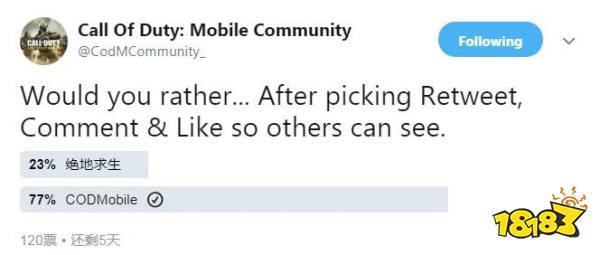 扩展阅读:推特投票《绝地求生》与《使命召唤手游》谁更好玩?近八成选择《使命召唤手游》