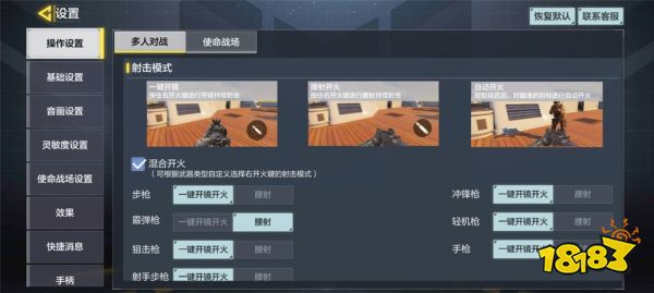2.在设置-射击模式中,我们有三种射击模式一键开火、腰射开火、自动开火选择。在这里大家就可以把自己的设计模式设置成腰射开火啦。当然,小编在这里推荐大家选择混合开火,然后将一些近距离武器比如霰弹枪和冲锋枪设置成腰射开火。