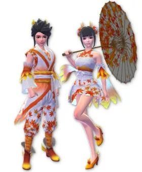非常有秋天气息的男女情侣套装枫叶样的纹饰,还伴有随身飘落叶子的周身特效。仅在10.1-10.7日的礼包内限时出售。