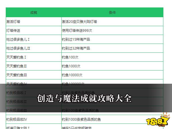 创造与魔法成就攻略大全,激活灯塔成就需要激活20座贝雅大陆灯塔获得,灯塔传送成就通过使用灯塔传送999次获得,吃过很多鱼儿Ⅰ成就通过钓到过15种海产品获得,钓到极品啦Ⅲ成就通过钓到100条紫色品质的鱼获得。