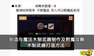 创造与魔法想打架打得过人,就必须要有一把攻击高的武器,创造与魔法将武器分成了普通,精良,史诗,传说四个等级,武器有剑、弓、斧头、稿子、木棒和法杖几种,又分为木制、铁制、金制、水晶、黑曜石,下面来看看木制武器的打造及附魔攻略。