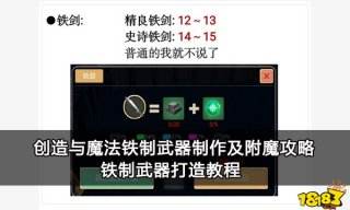 创造与魔法想打架打得过人,就必须要有一把攻击高的武器,创造与魔法将武器分成了普通,精良,史诗,传说四个等级,武器有剑、弓、斧头、稿子、木棒和法杖几种,又分为木制、铁制、金制、水晶、黑曜石,下面来看看铁制武器的打造及附魔攻略。
