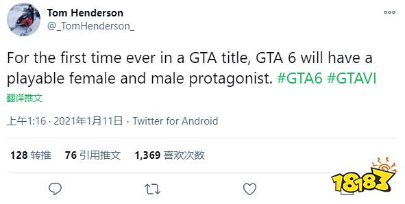 爆料者“Tom Henderson”昨日(1.11)在推特爆料,《GTA6》是《GTA》系列首次拥有一位可玩的女性主角和男性主角的游戏。不过,“Tom Henderson”并没有透漏更多内容。我们依旧不清楚这是否意味着《GTA6》拥有两位主角,一男一女;还是说像《赛博朋克2077》那样主角可以选择性别。