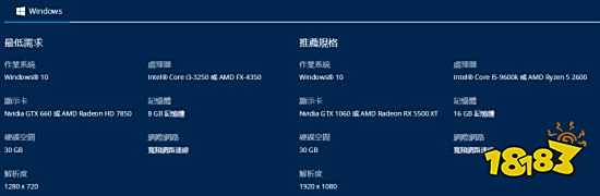 系统:Windows 10 处理器:Intel Core i3-3250 或 AMD FX-4350 显卡:Nvidia GTX 660 或 AMD Radeon HD 7850 内存:8 GB 硬盘空间:30 GB 网络:宽带网络连接 解析度:1280 x 720