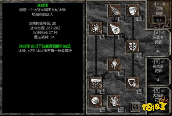 冰火法,顾名思义就是冰火两系双修的法师。虽然在冰冻系这条技能树上一直存在着“雪球之争”,但是博士个人还是推荐大家把主攻技能放在“冰封球”和“陨石”上。一般来说,大家60级左右就可以将这两个技能点满,冰火法就基本成型了。