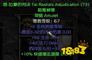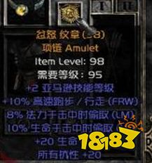 因为家3单系技能的项链,专属蓝色项链词缀,所以如果要叠高技能等级,+3单系技能的项链就是最好的选择。可选词缀有:100生命值、25DR(物理伤害减少)、35MF、30点力量、10%FCR(快速施法速度)。