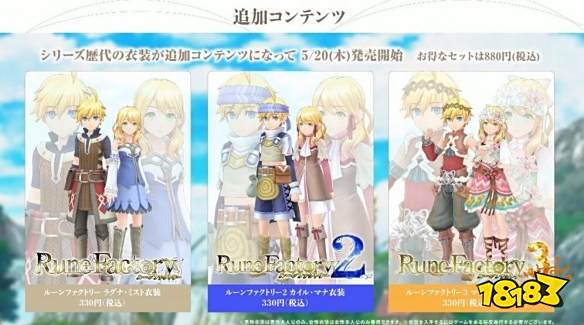 系列历代服装DLC分别是初代符文工房拉格纳&蜜斯特的服装、符文工房2凯伊鲁&玛娜的服装,符文工房3麦斯&希雅的服装,售价均为330日元(约合人民币19元),打包套装售价880日元(约合人民币52元)。