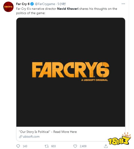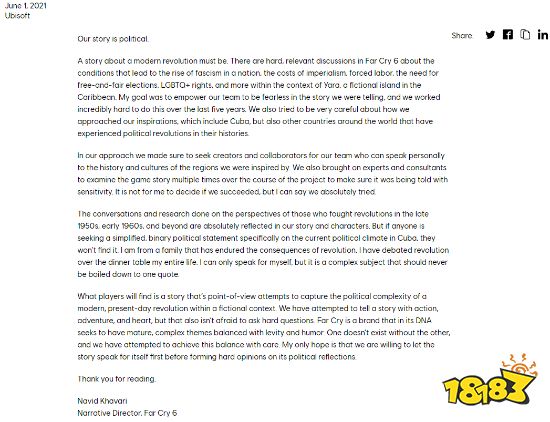 Navid Khavari在育碧官网中发布声明,同时《孤岛惊魂6》的官推也进行了转发。在声明他表示《孤岛惊魂6》是一个关于现代革命的故事,无可避免的要涉及许多尖锐的政治问题,包括法西斯因何在这个国家崛起、帝国主义的代价、强迫劳动、自由和公平选举的重要性、性少数群体的权力等等。