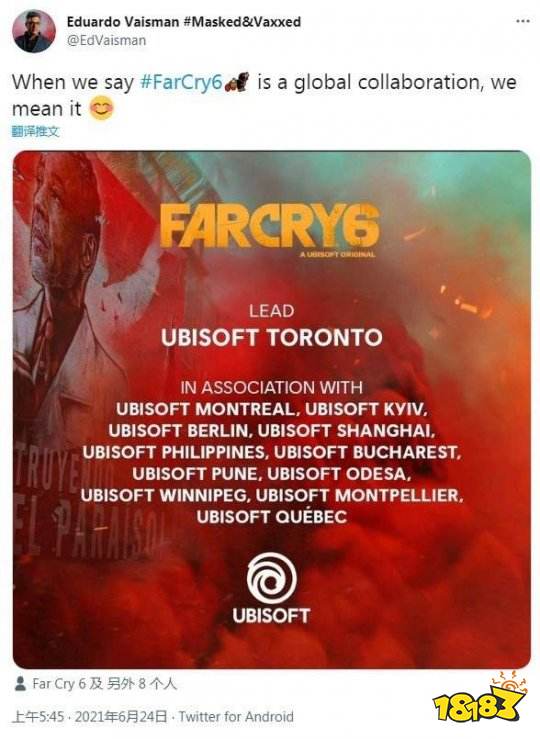 根据此前的介绍,《孤岛惊魂6》是由育碧多伦多工作室主导开发,而实际上还有多家工作室参与开发了本款游戏,包括育碧蒙特利尔、育碧上海、育碧浦那、育碧柏林、育碧敖德萨、育碧菲律宾、育碧蒙彼利埃、育碧魁北克、育碧温尼伯、育碧基辅以及育碧布加勒斯特。Vaisman不无自豪地表示:“当我们说‘《孤岛惊魂6》是一款全球协作制作的作品‘时’,我们可没在开玩笑。”