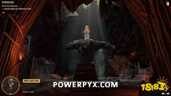 在洞穴内,与右侧的大头骨互动以打开宝库。