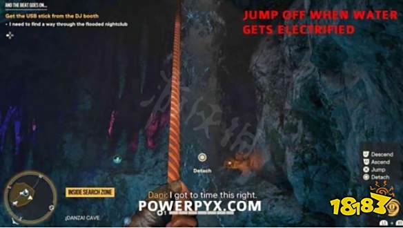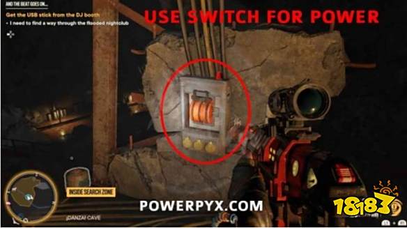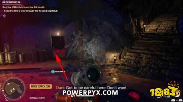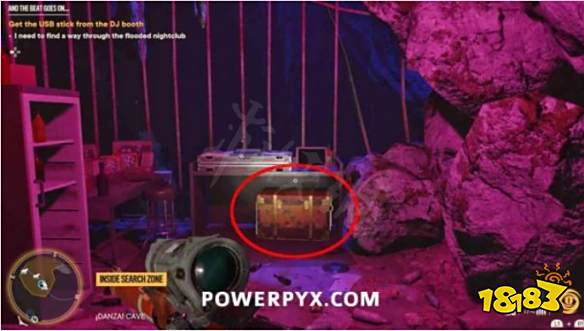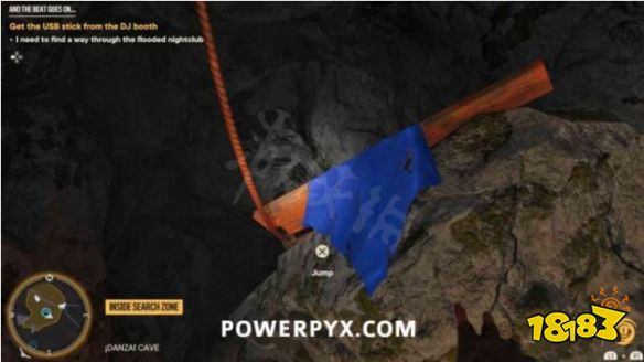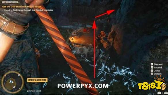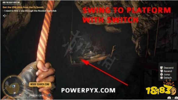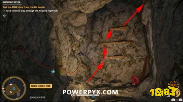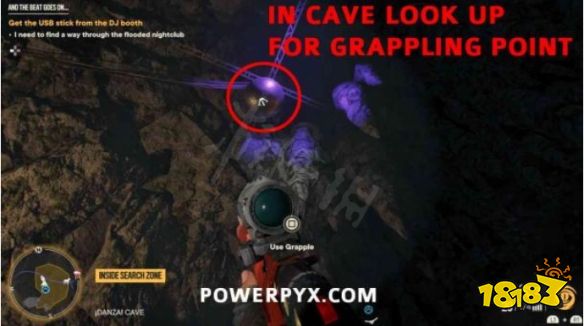 步骤1:摧毁宝藏起始音符右侧的木板。然后前往洞穴内的夜总会区。抬头看天花板,找到一个带有抓钩点的迪斯