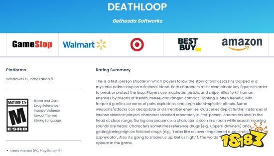 娱乐软件分级委员会(以下简称ESRB)分级委员会近日公开了《死亡循环》PS5以及PC版本分级信息。ESRB将本作分为“M”级(适合17岁或以上年龄的玩家),游戏中含有血腥、暴力、药物、脏话、性主题等内容。