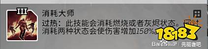 消耗大师:上面说到的配合细柳的灰烬效果,用来对精英打爆发伤害,技能或者近战上燃烧之后再补一枪就可以完美触发消耗大师的效果。