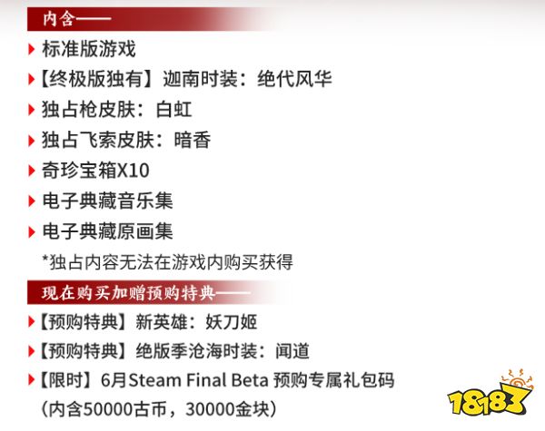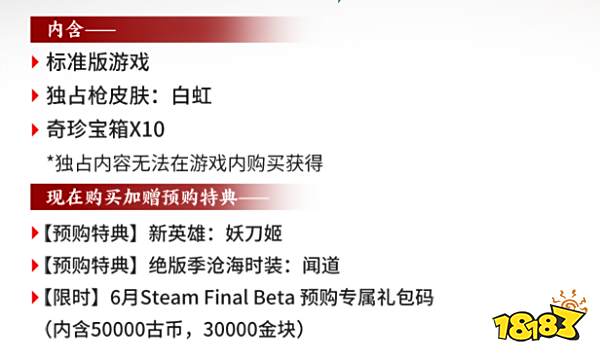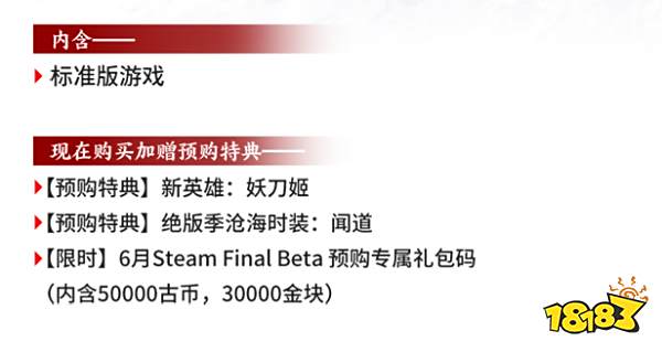 内含标准版游戏,预购还可以获得新英雄妖刀姬、绝版季沧海时装-闻道以及6月Steam Final Beta预购专属礼包码,其中通过礼包码可以兑换获得50000古币以及30000金块。
