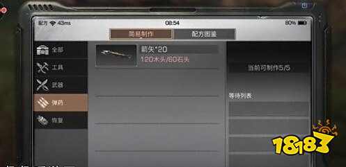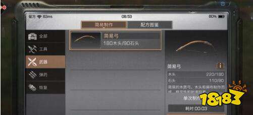 简易弓在配方按钮的武器栏一列,我们拥有足够的材料就可以将简易弓制作出来,制作过程需要耗时3秒钟,还需要花费180个木头和90个石头,制作武器是非常缺材料的,所以萌新们不要点多制作了,有了简易弓就需要箭矢这种弹药才能进行攻击,箭矢在配方弹药栏里可以制作,同样制作箭矢需要的是120个木头和80个石头,而箱子里的材料足够我们制作一把弓和20个箭矢,所以不用担心材料的不足。