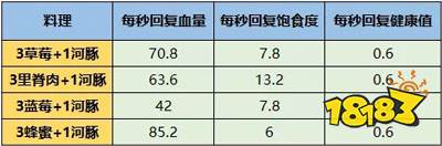 总的来说,蜂蜜是食材中回复血量最高的;烤河豚是料理中回复血量最高的;面粉和肉是回复饱食度最高的,苏眉鱼回复饱食度也相当高;蓝莓和牛奶都是回复健康值很高的食材;