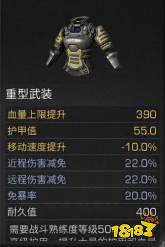 护甲性能:需要战斗熟练度等级50才能使用。高级护甲,提升大量的护甲和血量。