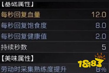 椰奶雪花糕在食用后每秒可回复血量12点、饱食度8点、健康值2点,且持续5秒。10分钟内,采集熟练度可以提升8%,采集熟练度升不上去的小伙伴,不妨多做点放身上吧!