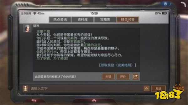 1 完美结局:首先要记住你是个帝国间谍,对话要小心,先选“为了胜利,我义不容辞”,然后选狼队,选封锁消息,就成功了。
