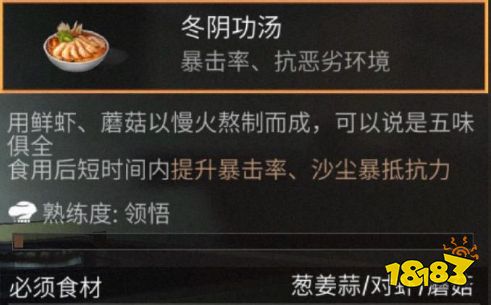 在明日之后里,冬阴功汤这道经典料理的效果与暴击率以及沙尘暴抵抗力有关系,在特殊地形有奇效,那么怎么制作呢?下面就为大家带来详细的攻略介绍,一起来看看吧!