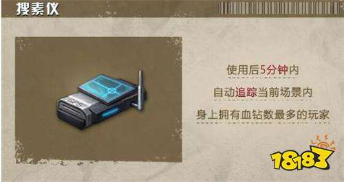 道具介绍道具介绍搜素仪的作用:在使用后可以在五分钟之内自动追踪远星城里滴血红钻数量最多的玩家,是追猎者的最佳选择之一。毕竟,滴血红钻数量的多寡关乎到玩家个人物资的囤积数量,影响着小伙伴的实力进阶。