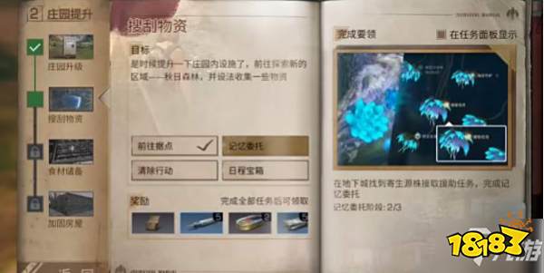 1、记忆委托任务是庄园提升-搜刮物资的任务之一。任务要求:在地下城找到寄生源株接取原著任务,完成3个阶段后即可达成任务要求;