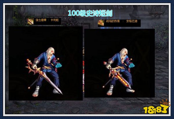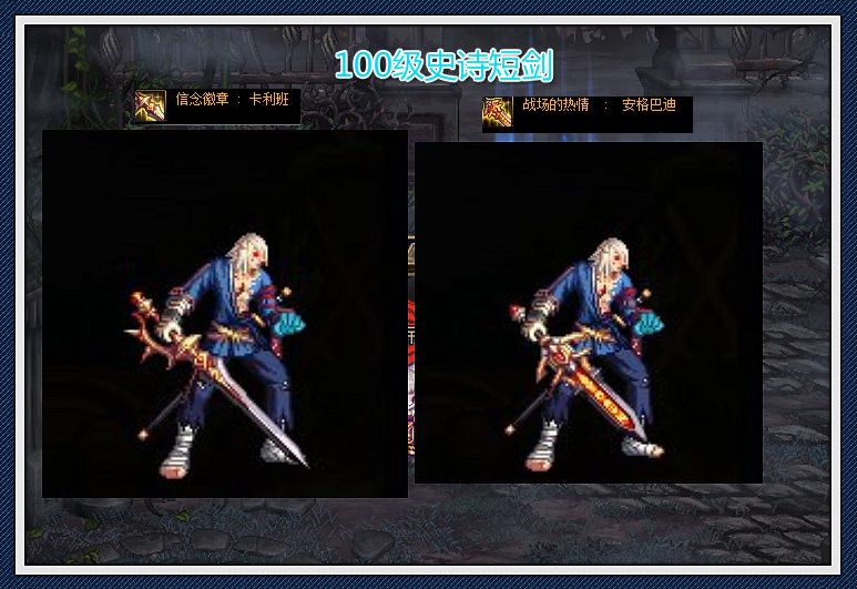先来看一下短剑的图标,信念徽章卡利班,外观倒是挺出众的,有点类似太刀,剑身较为修长。不过,战场的热情安格巴迪,就符合正常短剑标准,把“短”演绎的淋漓尽致。这两把100级史诗武器,从外观上来说,卡利班明显帅气一些,比肩一些幻化的外观。